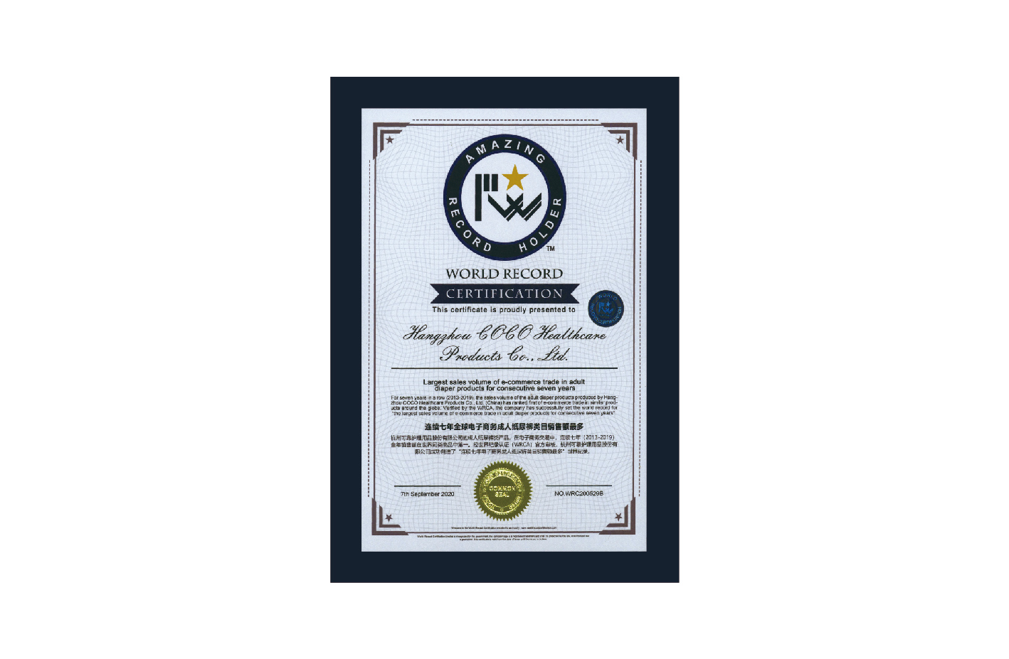 荣获“(2013-2019)电子商务成人纸尿裤类目销售额最多世界纪录认证”※